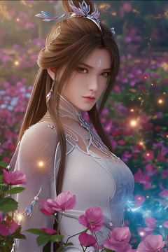 Masterpiece,Dazzling multicolored light,ultra detailed,1 girl,In the flowers,earrings,eyelashes,a charming face,glowing lips,clavicle,shoulder exposure,floating petals,dreamy and beautiful,upper_body,full shot.bikini,lxq-hd,