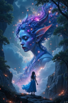 hyper detailed masterpiece, Dynamic, good quality,Liquor_dark,Elf portrait made of colorful stars,(Pointy-eared elves:1.5),flowing skirt,cigarette hair,jungle,firefly,unrealistic,The tree of life blooms with endless vitality,Twinkling stars in the night sky,Overlapping clouds and fog,Whimsical fantasy landscape art, Beautiful Art Ultra HD 8K, 8K highly detailed digital art, Beautiful and detailed fantasy, epic fantasy landscape, Mysterious and dreamy scenery, Magic fantasy very detailed, magical scenery, Made up of big snowflakes and dreamy floating fairy islands, Detailed fantasy digital art, 8K detailed digital art