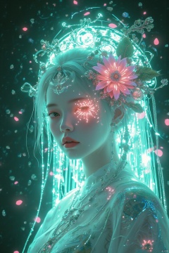 watercolor style,An Acrylic style painting that is expressive, gives it a dynamic and emotional quality. Anime art of a stylized portrait of a woman with a ethereal white and green mist surrounding her body. The mist creates a dramatic and surreal effect. A pink flower, that is blooming, covering one eye, attached to the face. The woman has a cold aesthetic, complimented by her white hair. Anime art of woman draped in shadows with a lighting that enhances her unique features. The background is dark green, filled with black rose petals.  shush, shushing motion,.,Winslow Homer style