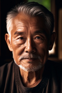 A hyper-realistic portrait of an elderly man, deep wrinkles and gray hair, straight-on view, softly lit by natural light. The background is a blurred, warm-toned room, enhancing his age and wisdom. HD quality, natural skin textures, Canon EOS R5, Rembrandt lighting, high contrast, sharp focus, cinematic detail