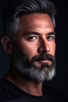 A detailed portrait of a middle-aged man with a salt-and-pepper beard, serious expression, captured in profile, under soft studio lighting. Background is a gradient from dark to light gray, focusing all attention on the subject. HD realism, fine skin textures, Hasselblad H6D, chiaroscuro technique, natural colors, impeccable detail