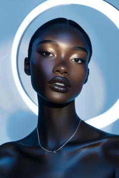 A photorealistic portrait of a woman with dark skin and bright makeup, frontal view, illuminated by a ring light, capturing every pore and detail. Background is a minimalistic, off-white color, with subtle shadows. Ultra-high detail, Canon RF 50mm f/1.2L lens, vibrant colors, studio quality, meticulously detailed
