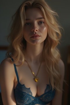 18 years old, (high definition), (cinematic) photo of girl in bedroom, high contrast, soft light, cute, petite, slender, Australian, (huge sagging breasts), petite toned body, (Wearing blue lace bra and gold heart locket necklace:1.4), Long blonde wavy hair, Big blue eyes, Highly detailed eyes, Highly detailed face, Highly detailed body, eyes open, Jewelry, (real skin, textured skin, intricately detailed eyes, perfect lips), (skin textures), (intricately detailed eyes:1.4), narrow hips, slim body, (subsurface scattering), (dim cozy lighting), warm rich dark color palette