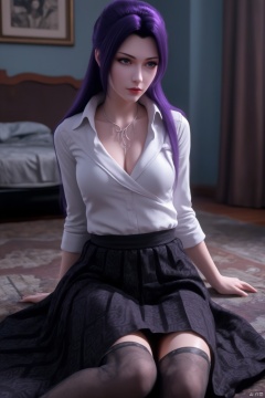 (masterpiece, best quality:1.4),finely detailed,YunYun, 1girl, solo, long hair, breasts, cleavage,white shirt,pleated skirt , jewelry, sitting, purple hair, necklace, Black silk thighhighs, tattoo, makeup, shoes,bedroom,sitting on the carpet,