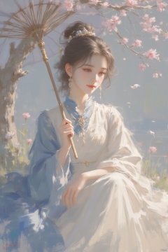 1girl, solo, long hair, brown hair, hair ornament, long sleeves, dress, holding, jewelry, sitting, closed mouth, full body, flower, water, hair bun, white dress, tree, sash, blue dress, bird, umbrella, chinese clothes, holding umbrella, hanfu,gurenyun