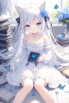 loli,1girl,solo,long hair,looking at viewer,blush,smile,bangs,blue eyes,hair ornament,long sleeves,dress,ribbon,bare shoulders,sitting,very long hair,closed mouth,collarbone,hair ribbon,flower,white hair,puffy sleeves,indoors,hair flower,off shoulder,white dress,sleeves past wrists,book,petals,blue dress,rose,animal,halterneck,bug,butterfly,puffy long sleeves,blue flower,on floor,off-shoulder dress,criss-cross halter,blue rose,book stack,blue butterfly,