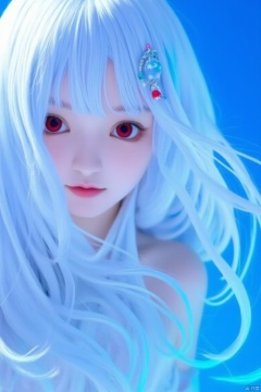 a pretty anime girl with big flowing blue hair and a blue background, 1girl, solo, long hair, red eye ,looking at viewer, hair ornament, white hair,red eye