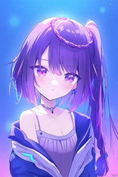 masterpiece,best quality,high quality,(colorful),loli,1girl,solo,long hair,looking at viewer,upper body,head tilt,blue theme,jacket,closed mouth,earrings,bare shoulders,off shoulder,jewelry,strap slip,collarbone,camisole,blue background,backlighting,pink background,multicolored hair,gradient background,simple background,hair between eyes,expressionless,spaghetti strap,blue jacket,shirt,sidelocks,glowing,Blur,float light, braid, mole, braided_ponytail, single_braid,purple hair,purple eyes,