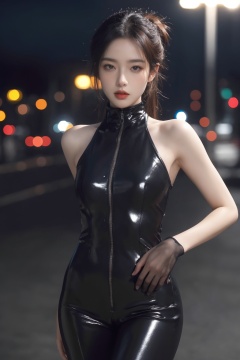 masterpiece, best quality, masterpiece,best quality,official art,extremely detailed CG unity 8k wallpaper,woman,photorealistic, masterpiece, realistic,8k, RAW photo, best quality, masterpiece:1.4),(real picture, intricate details), ultra-detailed, ultra highres, depth field,(1girl:1.2), (SOLO:1.2) (alone:1.2), (single1.2), (only one:1.2), (one character:1.2)floating, expresionless, turtle neck, close up photo, long hair, from lower, standing, bright, two tone lighting, octane, (low key:1.3),Perfect female body shape, delicate and perfect face, (long legs:1), slim, small breasts, underboob,  , bodysui, Deep V, Zipper not closed, Reflective catsuit, High ponytail, Black rubber gloves, night, A gloomy urban night, The streets of the city at night,    <lora:美女:0.8>