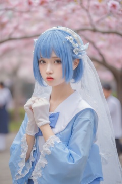 The image shows a young woman with blue hair styled in a traditional Japanese anime style. She is wearing a blue and white dress with a white headpiece and a white veil. The dress has a blue bow on the neckline and white gloves. The woman is standing in front of a tree with pink cherry blossom trees in full bloom. She has a serious expression on her face and is looking directly at the camera. The background is blurred, but it appears to be a park or garden with other people walking around.