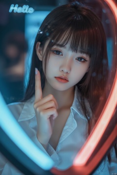 This is a modern style image of a beautiful woman touching a mirror with her hand. The image in the mirror shows a woman wearing a white shirt. Touching her finger, the text "Hello FLUX" is focused at the top of the image, and the light is focused on the person from top to bottom, creating an atmosphere in the photo. There are blue and red neon lights around the mirror