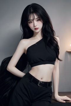 masterpiece, best quality, masterpiece,best quality,official art,extremely detailed CG unity 8k wallpaper,woman,photorealistic, masterpiece, realistic,araffed woman in black top and black pants posing for a picture, jiyun chae, wavy long - length black hair, shoulder-length black hair, lu ji, +81 magazine, wavy shoulder-length hair, kim hyun joo, physical : tinyest midriff ever, tinyest midriff ever, Wang Yuanqi, black wavy hair with bangs, long thin black hair, huge belt, female actress from korea, Du Qiong, Huang Ji, Qian Du, portrait of female korean idol, wavy long black hair, black long hair, shoulder length black hair, id magazine, Hu Zaobin, dilraba dilmurat, wavy black hair, black wavy hair, no logo, beautiful midriff, jia, Chen Jiru, gold belt, Luo Mu <lora:模特:0.8>