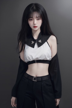 masterpiece, best quality, masterpiece,best quality,official art,extremely detailed CG unity 8k wallpaper,woman,photorealistic, masterpiece, realistic,araffed woman in black top and black pants posing for a picture, jiyun chae, wavy long - length black hair, shoulder-length black hair, lu ji, +81 magazine, wavy shoulder-length hair, kim hyun joo, physical : tinyest midriff ever, tinyest midriff ever, Wang Yuanqi, black wavy hair with bangs, long thin black hair, huge belt, female actress from korea, Du Qiong, Huang Ji, Qian Du, portrait of female korean idol, wavy long black hair, black long hair, shoulder length black hair, id magazine, Hu Zaobin, dilraba dilmurat, wavy black hair, black wavy hair, no logo, beautiful midriff, jia, Chen Jiru, gold belt, Luo Mu <lora:模特:0.8>