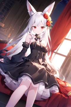 1girl, solo, long_hair, hair_ornament, dutch_angle, white_hair, animal_ears, sitting, long_sleeves, red_eyes, flower, hair_flower, window, watermark, black_hair, dress, detached_sleeves, curtains, feet_out_of_frame, multicolored_hair