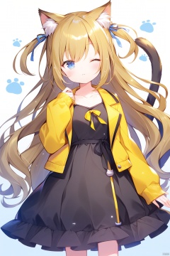 solo, 1girl, animal_ears, long_hair, blue_eyes, dress, open_clothes, one_eye_closed, black_dress, jacket, tail, long_sleeves, two-tone_background, open_jacket, closed_mouth, cat_ears, white_background, looking_at_viewer, yellow_jacket, sleeves_past_wrists, animal_ear_fluff, cat_tail, collarbone