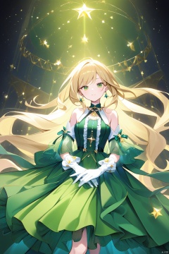 1girl, solo, gloves, long hair, green eyes, star \(symbol\), earrings, jewelry, blonde hair, dress, white gloves, looking at viewer, bare shoulders, detached sleeves, frills, green dress