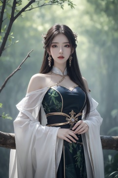 1girl, bamboo, bare shoulders, bare tree, blurry, blurry background, blurry foreground, branch, breasts, chinese clothes, depth of field, dress, earrings, forest, green eyes, jewelry, leaf, long hair, long sleeves, looking at viewer, makeup, nature, palm tree, parted lips, plant, solo, standing, tree, wide sleeves <lora:天穹1.0:0.8>