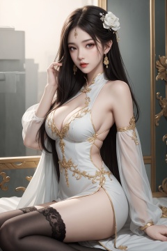 1girl, black hair, breasts, building, chinese clothes, dress, earrings, facial mark, forehead mark, hair ornament, jewelry, lips, long hair, looking at viewer, makeup, solo, thighhighs <lora:eye:0.8>