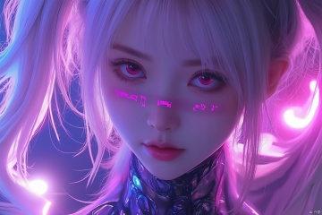 masterpiece, best quality, illustration, beautiful detailed eyes,colorful background,mechanical prosthesis,mecha coverage,emerging dark purple across with white hair,pig tails,disheveled hair,fluorescent purple,cool movement,rose red eyes,beatiful detailed cyberpunk city,multicolored hair,beautiful detailed glow,1 girl, expressionless,cold expression,insanity, long bangs,long hair, lace,dynamic composition, motion, ultra - detailed, incredibly detailed, a lot of details, amazing fine details and brush strokes, smooth, hd semirealistic anime cg concept art digital painting