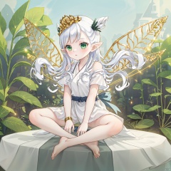 masterpiece, bestquality, 1girl, solo, long hair, green eyes, white hair, wings, barefoot, pointy ears,