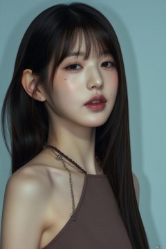RAW photo,1girl,full body photo of a beautiful korean girl with long hair wearing halter dress, necklace, dslr, soft lighting, high quality, film grain,  light reflections, blood vessels,  pale skin, skin pores,blood vessels in sclera, detailed skin, skin fuzz,1girl