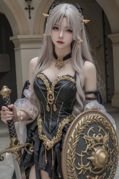 AKJK,Half-body, Lolita, a woman,Exaggerated breasts, exaggerated cleavage, exaggerated long hair, jewelry, sword in left hand, shield in right hand, half body