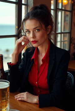 a beautiful woman in a cafe,25yo,Kristen Stewart lookalike,exquisite face,soft shiny skin,smile,elegant jacket and shirt,[black and red colors],high ponytail,backdrop of oceanview cafe,window,table,beer mug,bottle,flower,masterpiece,best quality,realistic,detailed,sharp focus,high contrast,rule of thirds,chiaroscuro lighting,ek_real_b00ster