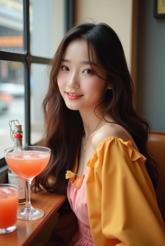 Photo of a beautiful girl in a cafe,20yo,K-pop girl,ulzzang,exquisite face,soft shiny skin,long hair naturally flowing over shoulder,gentle smile,elegant dress,[pink and yellow colors],backdrop of city street cafe,window,table,cocktail,bottle,flower,masterpiece,best quality,realistic,detailed,sharp focus,high contrast,rule of thirds,chiaroscuro lighting,ek_real_b00ster
