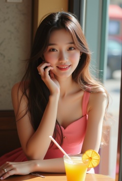 Photo of a beautiful girl in a cafe,20yo,K-pop girl,ulzzang,exquisite face,soft shiny skin,long hair naturally flowing over shoulder,gentle smile,elegant dress,[pink and yellow colors],backdrop of city street cafe,window,table,cocktail,bottle,flower,masterpiece,best quality,realistic,detailed,sharp focus,high contrast,rule of thirds,chiaroscuro lighting,ek_real_b00ster