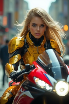 A cyborg girl riding a bike,detailed exquisite face,long blonde hair blowing,blue eyes,gold and red colored armor suit,kawasaki ninja h2r,blurry city street,realistic,detailed,sharp focus,high contrast,rule of thirds,chiaroscuro lighting,ek_real_b00ster,ek_art_b00ster,ek_an1_b00ster