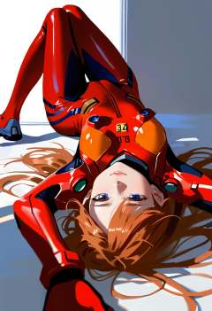 solid white ground, 1 souryuu asuka langley, perspective, upside-down, reaching towards viewer, open hand, red pilot suit, red plugsuit, red bodysuit, lying, on back, long hair, messy hair, blank stare, lips, upper body, feet out of frame, half-closed eyes, amazing quality, sunshine, beautiful color, (by baihuahua|by trickortreat|by as109|by wlop|by shiroski)