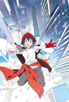 amazing quality, flat color style, by ixy, from above, 1 izumo fuuko, solo, nervous, red beanie, white shirt, red gloves, sleeves, jacket around waist, pants, outdoors, cityscape, falling down, reaching towards viewer, skyscraper