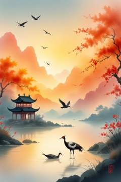 chinese ink drawing,inkThe sunset and the solitary crane fly together,The autumn water is the same for a long time,The beauty of ancient poetry,the setting sun,Wild geese in the sky in the distance,Ancient buildings are scattered