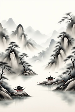 chinese ink drawing,Traditional Chinese painting,Ancient rhyme Jiangnan,Yamakawa,Cypress,Pavilions,Leave white space,elegant