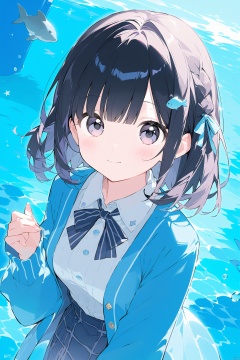 1girl, aquarium, skirt, solo, hair_ornament, looking_at_viewer, bangs, breasts, blush, smile, closed_mouth, shirt, long_sleeves, medium_breasts, blue_cardigan, dutch_angle, buttons, black_hair, blue_eyes, page_number, brown_hair, fish, water, cardigan, short_hair, shiny_hair, ribbon, shiny, open_clothes, braid, multicolored_hair, sleeves_past_wrists, hairclip, jacket, frills, hair_ribbon, white_shirt,