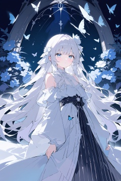 night,glowing eyes,gothic,long dress, 1 girl, solo, long white hair, blue eyes, detailed eyes, blink and youll miss it detail,butterfly, flower garden, high quality, floral background, very detailed,off shoulder