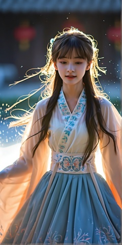 一个穿着汉服正在跳舞的16岁淡妆女生,雾气,丁达尔效应,长发飘飘