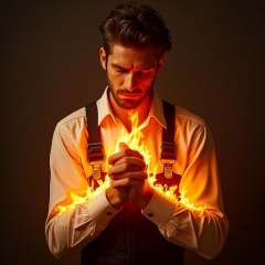 facing_straight_ahead, clasped_hands, simple_background, embers, view_from_top, overalls, burning, closed_mouth, beating_the_chest, front_right, pyrokinesis, mouth_slightly_open, facial_hair