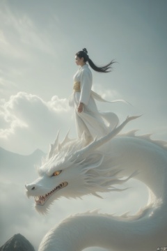 Captured in a low-angle perspective, a woman in a white kimono stands on top of a white dragon. Her hair is pulled back in a ponytail, and she's wearing a gold belt around her waist. Her dress is long-sleeved, and her hair is tied in a bun at the top of her head. Her eyes are a piercing yellow, and the dragon's head is adorned with long white wigs. The backdrop, a mountain range can be seen in the lower left corner of the frame, and a cloudy sky is visible in the upper right corner.