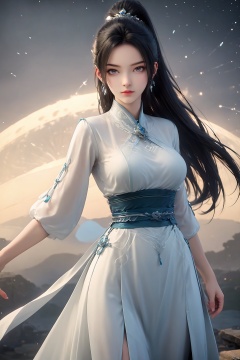 SFW,(masterpiece:1.2),best quality,absurdres,masterpiece,original,extremely detailed wallpaper,perfect lighting,(extremely detailed CG:1.2),1girl,solo,long hair,looking at viewer,black hair,hair ornament,dress,jewelry,closed mouth,ponytail,earrings,white dress,sash,chinese clothes,from different angles,ninyao