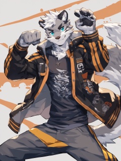 source_furry, jacket, streetwear, paw pose, blep, score_7_up, by littleblackalas <lora:littleblackalasxl_:0.8>