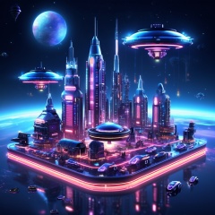 futuristic miniature sci-fi city, with tiny flying cars, neon lights, and towering structures. Sleek, metallic tones with glowing holograms. Background with a vast, dark sky and distant planets. Details include tiny robotic figures, intricate circuit patterns, and futuristic textures.