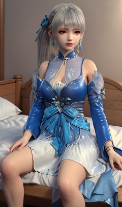 3D,masterpiece,(best quality),(makeup),official art, extremely detailed cg 8k wallpaper,((crystalstexture skin)), (extremely delicate and beautiful),(highly detailed),(face),(double_ponytail),(collar),(1girl), (solo), (jewelry), (earrings),(white_hair),(long_hair),(hair_ornament),(handwear),(long_sleeves),(breast),((sitting)),((upper_body)),(dress),(shorts_under_skirt),(chinese_clothes),(multicolored_clothes),(multicolored_dress),,(shiny_clothes),(long_legs),(sash),(closed_mouth),(room,bed),((looking_at_viewer)),((Facing the camera)),, <lora:hipoly3DModelLora_v10:0.3>