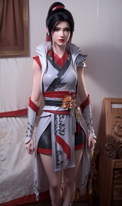 3D,masterpiece,(best quality),(makeup),official art, extremely detailed cg 8k wallpaper,((crystalstexture skin)), (extremely delicate and beautiful),(highly detailed),(face),(ponytail),(collar),(1girl), (solo), (jewelry), (earrings),(black_hair),(long_hair),(hair_ornament),(handwear),(wristband),(breast),((standing)),((upper_body)),(dress),(shorts_under_skirt),(chinese_clothes),(multicolored_clothes),(multicolored_dress),,(shiny_clothes),(long_legs),(sash),(armored_dress),(thigh_Ring),(closed_mouth),(room,bed),((looking_at_viewer)),((Facing the camera)),, <lora:hipoly3DModelLora_v10:0.3>