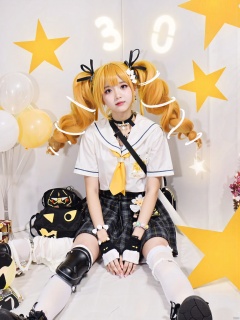AKJK,1girl, solo, long hair, looking at viewer, bangs, skirt, blonde hair, shirt, hair ornament, thighhighs, gloves, ribbon, twintails, jewelry, sitting, closed mouth, school uniform, full body, hair ribbon, white shirt, short sleeves, boots, necktie, choker, black gloves, socks, fingerless gloves, black skirt, sailor collar, bag, star \(symbol\), black footwear, bracelet, white thighhighs, plaid, black choker, plaid skirt, drill hair, white socks, knee pads, balloon, yellow necktie