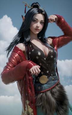 score_9, score_8_up, score_7_up, 8k, best quality, masterpiece, (ultra-detailed), solo, upper body:1.1), looking at viewer,<lora:pingping-pony-Tanger:0.8>, pingping, coquette, pointy ears, Red coat, fur skirt, by heishenhua, game cg, 1girl, barefoot, black hair, long hair, standing, hair ornament, beautiful blue sky, cloud, standing, upper body, looking at viewer,  close-up, dynamic angle, cleavage, <lora:Turquoise Style LoRA_Pony XL v6:0.25>, traditional media, realistic,
