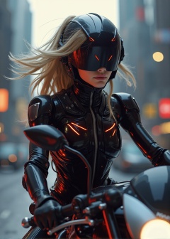 a cyborg girl in mecha armor. black and red colored armor. neon light lines glowing, exquisite face, soft shiny skin, blonde hair blowing, blue eyes, ., riding a motor cycle,kawasaki ninja h2r at high speed,city street backdrop, dynamic pose, focused expression, ., realistic,detailed,masterpiece,best quality,sharp focus,high contrast,rule of thirds,depth of perspective,trending on artstation,chiaroscuro lighting, ek_real_b00ster,ek_art_b00ster, .