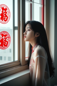 一个亚洲女孩,靠立在窗台,长发,窗户上贴着红色的窗花,窗花图案有“二道口”三个字,黑的背景是卧室,强对比度,电影光效,超高清晰度,丰富细节,