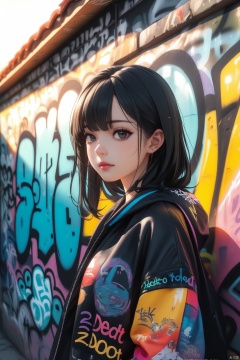 一个穿着时尚现代服饰的黑发女孩站在胡同涂鸦墙前,衣袖写着彩色的文字“二道口”,强对比度,电影光效,超高清晰度,丰富细节,