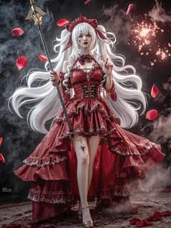AKJK,Half-body, Lolita, a girl,White hair color, exaggerated cleavage, exaggerated breasts, extra long and exaggerated hair, spiral hairstyle, blood red clothes, face tattoo, stockings, left foot standing, right foot raised, both hands holding spear, magic effects, ROSE PETAL falling
